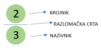 U zapisu razlomka koristimo se razlomačkom crtom. Broj iznad razlomačke crte naziva se brojnik, a broj ispod razlomačke crte naziva se nazivnik.